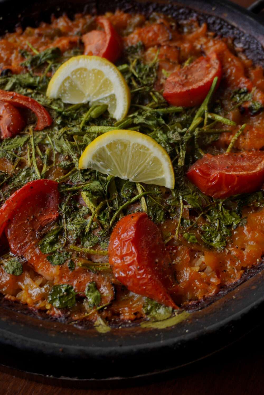 (魚介のパエリアかベーコンとクレソンとフルーツトマトのパエリアをお選びいただけます)